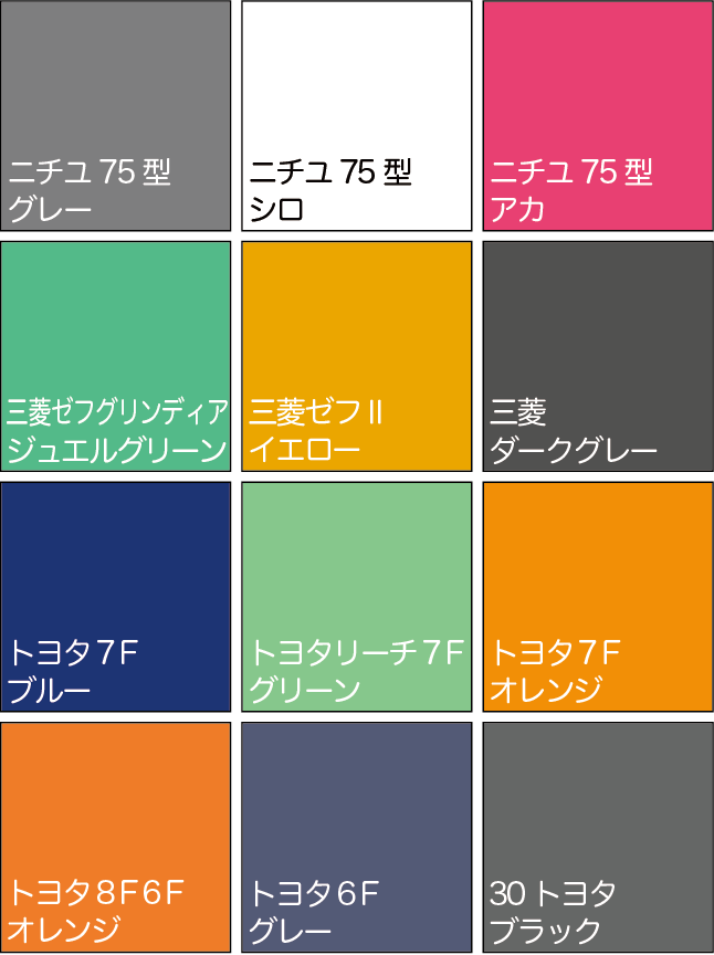 フォークリフト専用カラーに調合してあるため、色を探す手間が省けるのも特徴の一つです。
