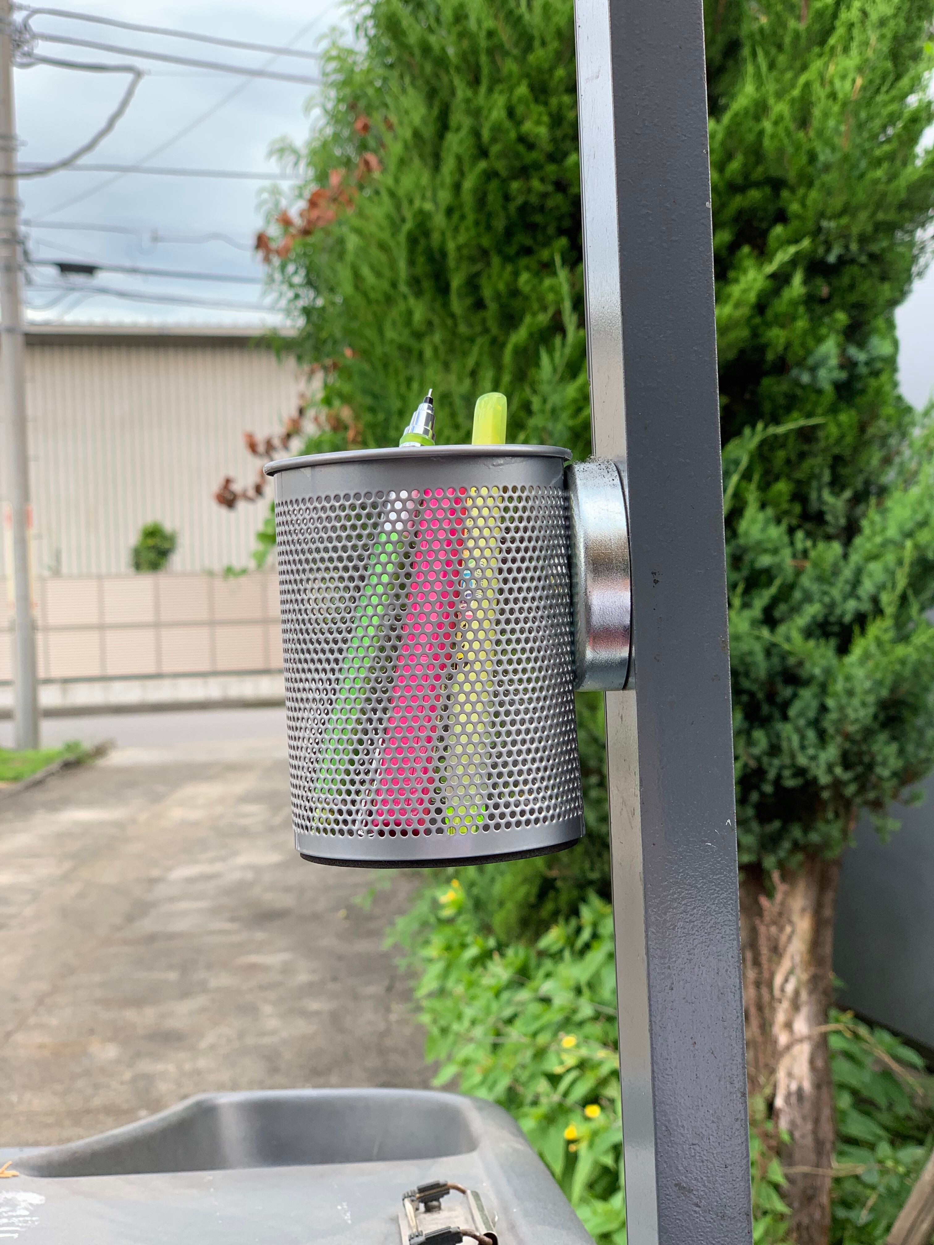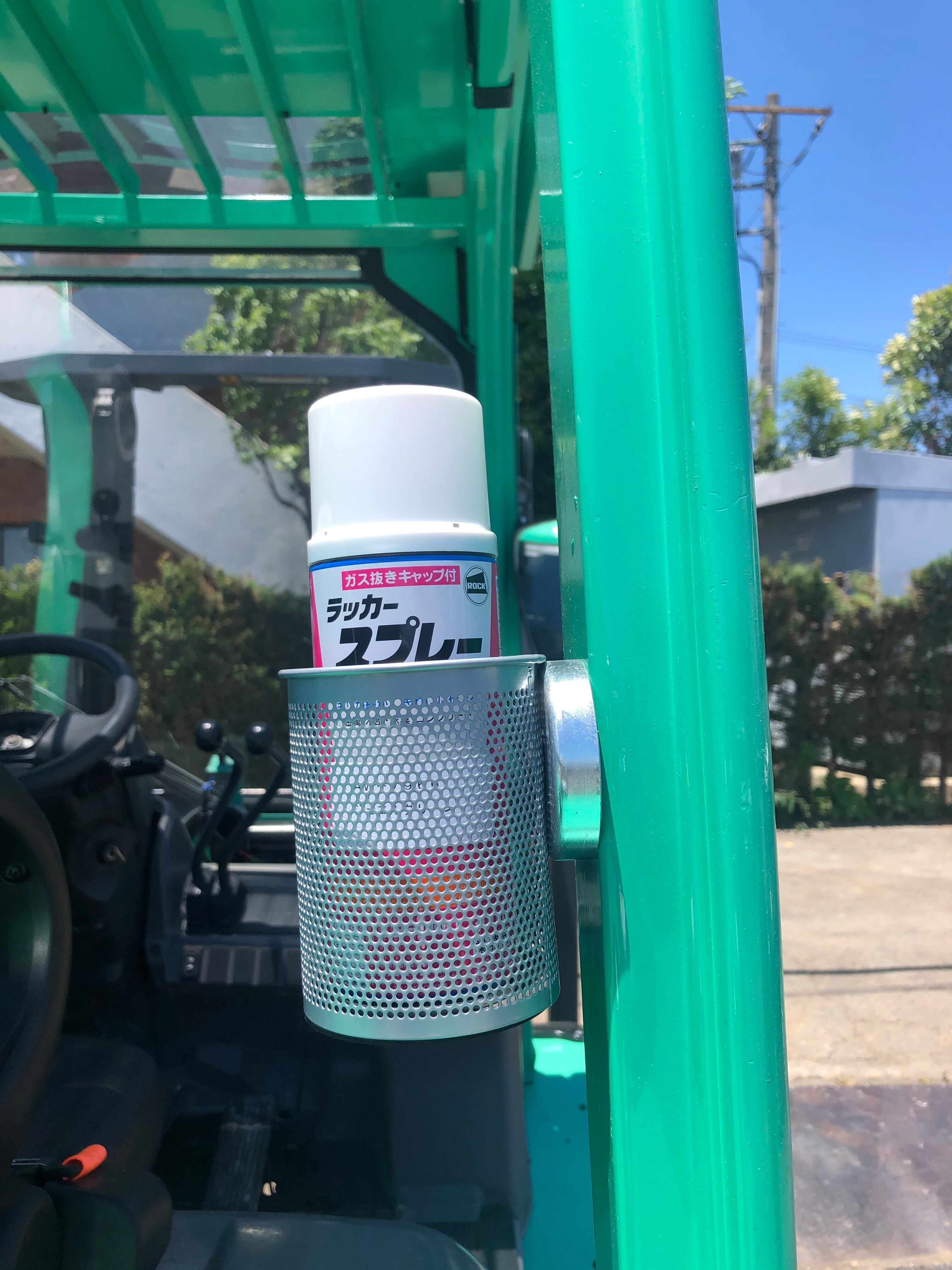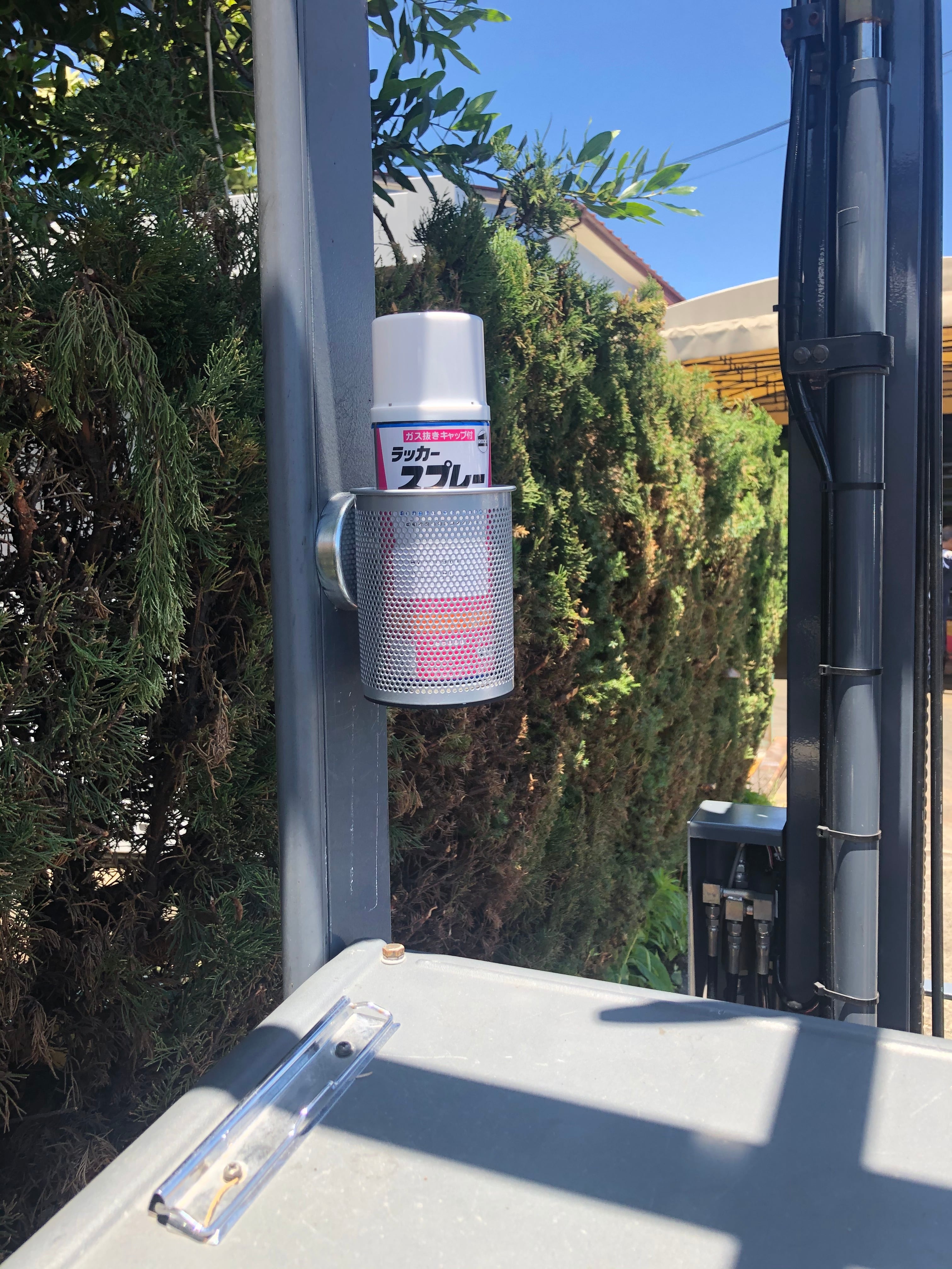 フォークリフトにホルダーを付けタッチアップスプレーを入れておけばいつでも綺麗になります。